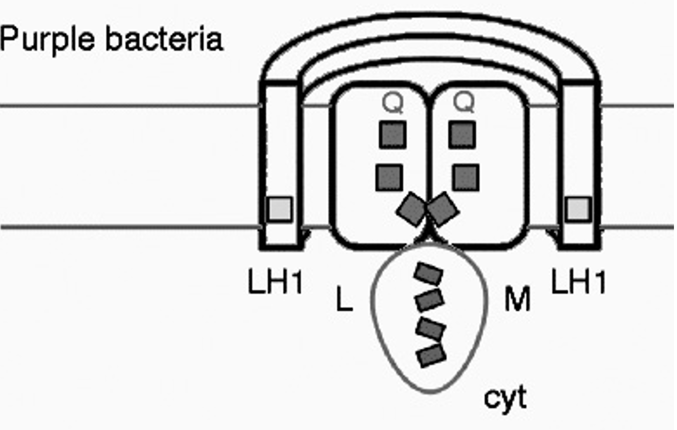 The reaction centre from purple bacteria is composed of two core proteins (M and L), and 14 co-factors. Electrons move up one side of the RC, and the structure of the RC IS LIKE PSII of higher plants. Protons are moved from the cytoplasm to the periplasm.